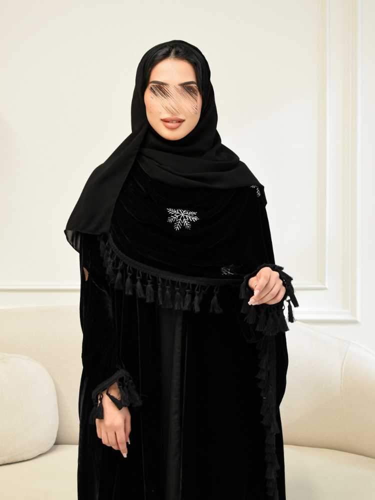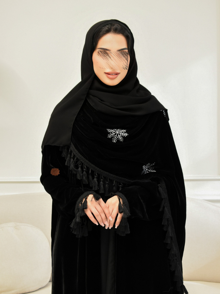 عباية "بلوريس" تتميز بتصميم يجمع بين الرقي والأناقة، حيث تم صنعها من قماش المخمل الأسود الفاخر الذي يضفي لمسة من الفخامة. يزينها تطريز فريد بشكل بلورة الثلج البيضاء، مما يضيف لمسة من التميز والجاذبية. تُعتبر "بلوريس" الخيار المثالي لكل امرأة تبحث عن الأناقة والتميز في عالم العبايات.