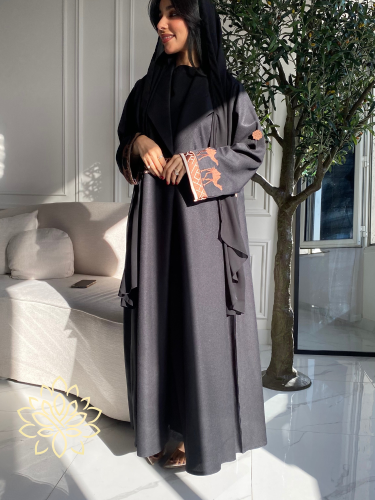 في ليلة مقمرة، نسجت داليا عباية "الناقة" من قماش الكريب الأسود الفاخر وأكمام بالخيوط السحرية البنية، مما يجعلها واحدة من أجمل العبايات الفاخرة. طرزت عليها رسومات ناقة تجسد القوة والجمال، مما يجعلها مثالية للمرأة التي تبحث عن عبايات أنيقة ومطرزة. أصبحت "الناقة" رمزًا للسحر والصمود، وتحمل في طياتها أسرار الصحراء وهمسات الرياح، مما يجعلها خيارًا رائعًا للعبايات السعودية التقليدية والفاخرة.